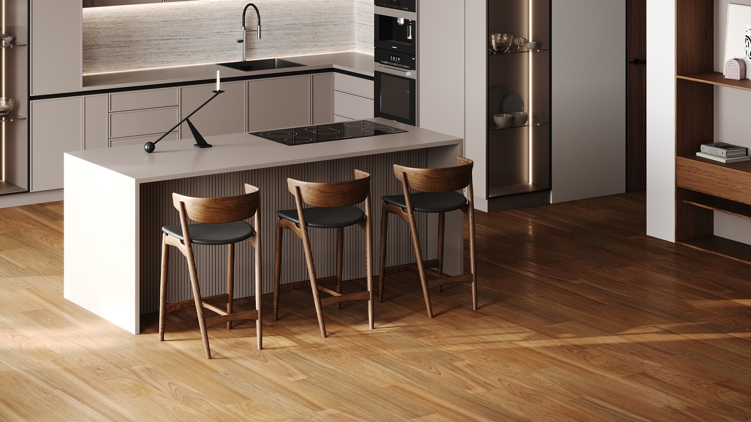 Это напольное покрытие из натурального дерева на каменной основе, которое можно уложить в любой комнате. И даже в ванной! Кварцпаркет укладывают без порогов на большой площади (до 144 м2), чтобы наслаждаться теплом прикосновений и рисунком из прожилок живого дерева.