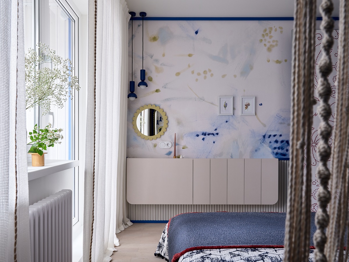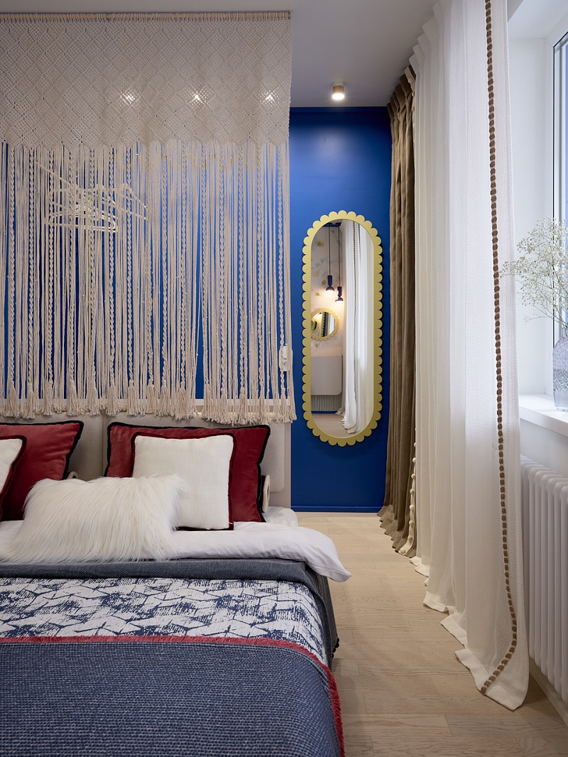 В спальне основной фон сделали спокойным, яркий акцент добавили в гардеробной — её оформили в насыщенном синем цвете.