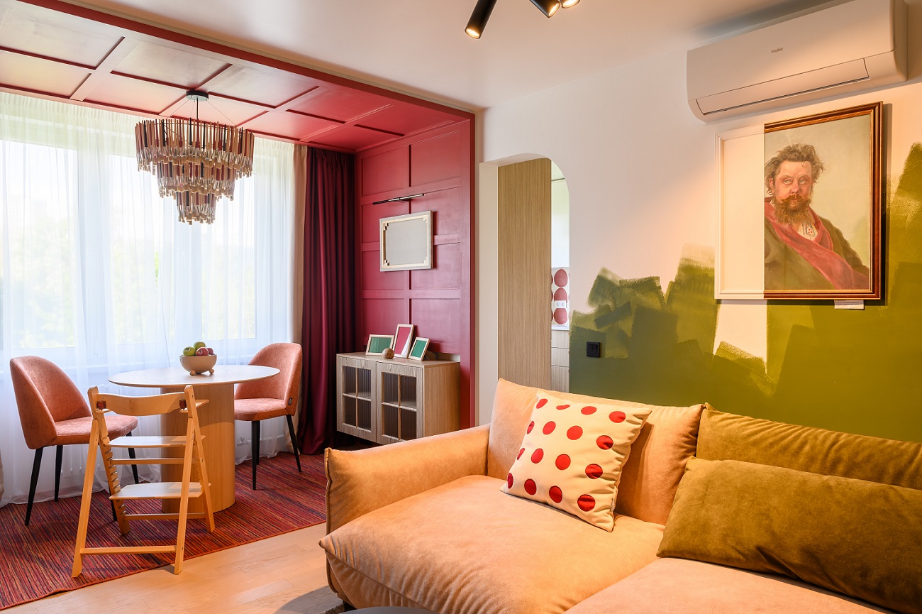 Весь интерьер получился очень гармоничным, и по цветовой гамме, и по расстановке мебели. Не обошлось и без лёгкого хулиганства дизайнера в виде частично закрашенных картин.