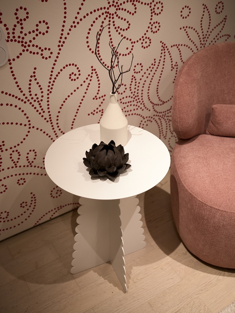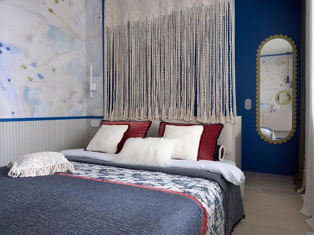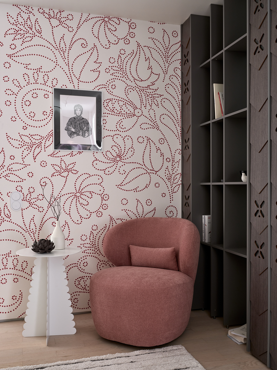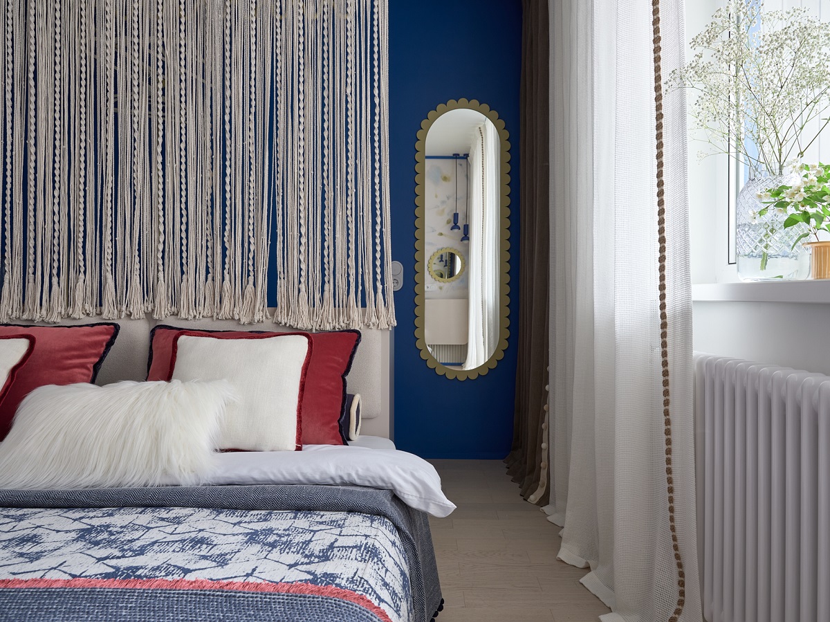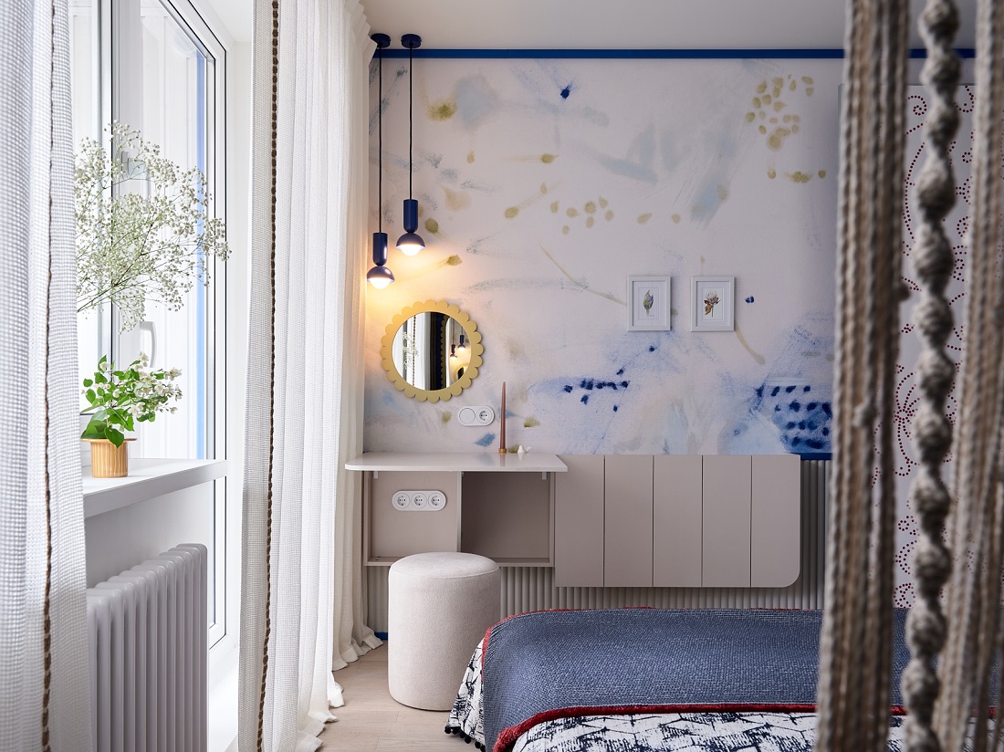 Фоном для оформления стал белый цвет, создающий светлое и воздушное настроение. При этом дизайнер решила добавить в интерьер характерные элементы русского декоративно-прикладного искусства. На одной из стен появилась роспись с яркими ягодами — мотив, вдохновлённый традиционными орнаментами. Вместо привычной гжели выбрали насыщенный красный цвет, который оживил пространство, не перегружая его.
