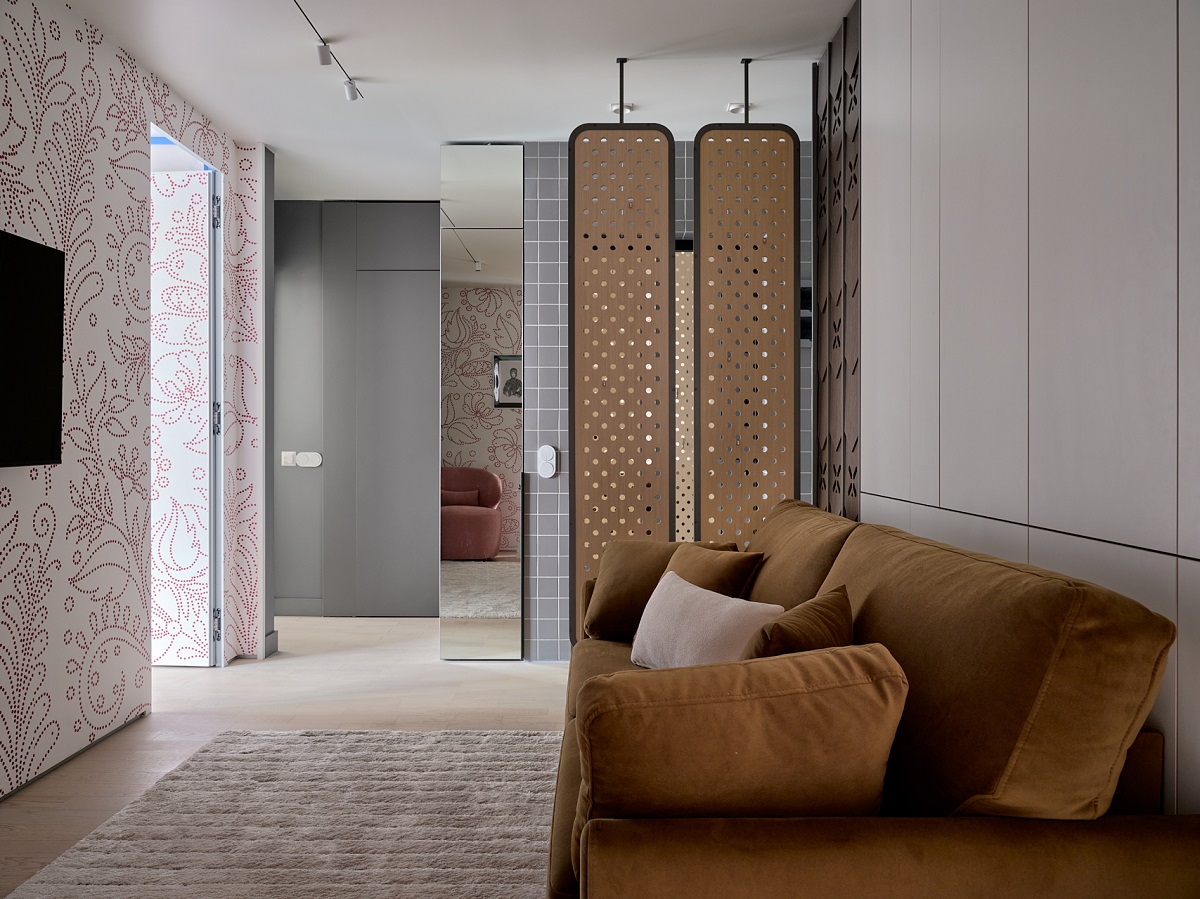 Уютная комната в новом проекте «Квартирного вопроса» объединяет несколько функций: прихожая, гостиная и спальня здесь живут вместе, но не мешают друг другу.