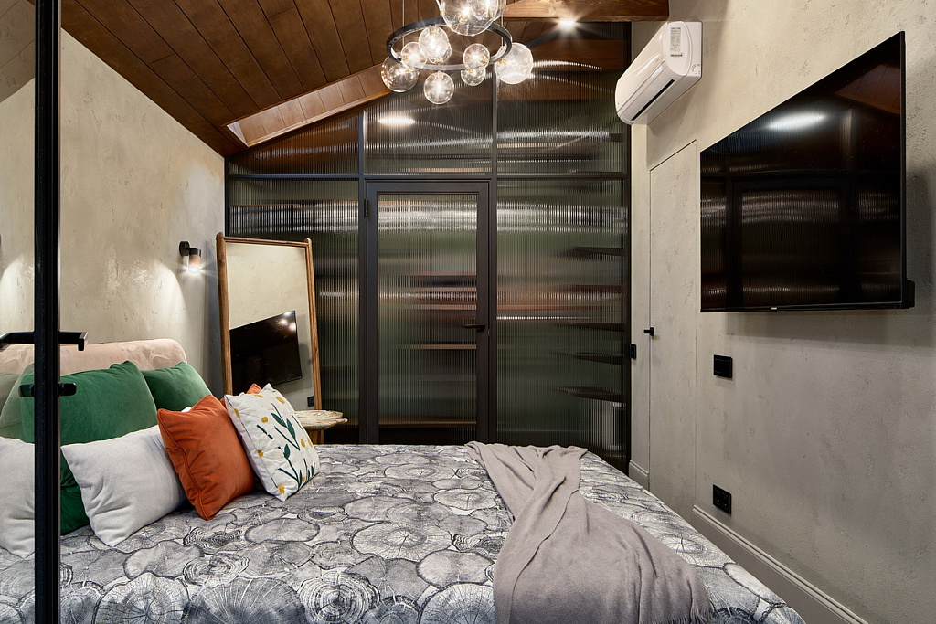 Комнату площадью менее 20 м<sup>2</sup> разделили на три части. Это позволило сделать жизнь героев «Дачного ответа» максимально комфортной, поскольку их спальня превратилась в настоящую квартиру-студию, отдельную от остального дома. Прежде всего, в ней появилась кровать шириной 180 см для комфортного сна.